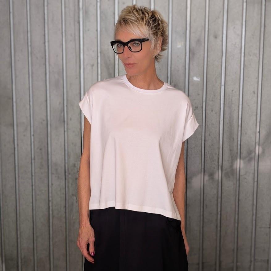 Camiseta básica de manga corta amplia, cuello redondo y patrón cuadrado, cómoda y minimalista. Abertura en los laterales.