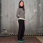 La mezcla del pantalón negro con el jersey de rayas crea una base equilibrada, y el blazer denim suma ese aire urbano tan actual. Combínalo con la bota track y tendrás un look perfecto para tu día a día.