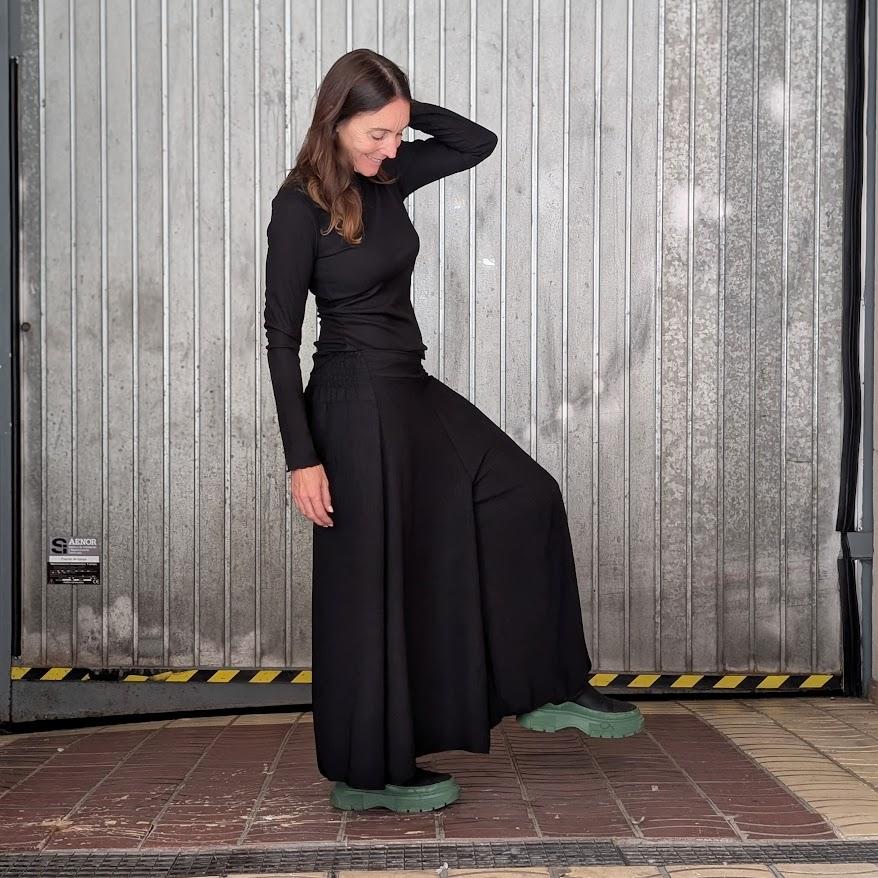 Esta falda pantalón combina lo mejor de dos mundos: la fluidez de una falda con la comodidad de un pantalón. Su pernera muy ancha ofrece movimiento sin restricciones, mientras que la cinturilla ancha con goma en la parte de atrás garantiza un ajuste adaptable sin necesidad de cierres.