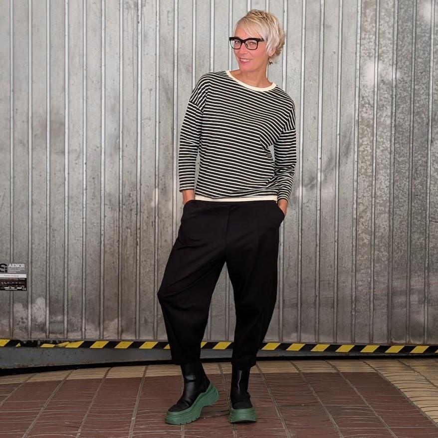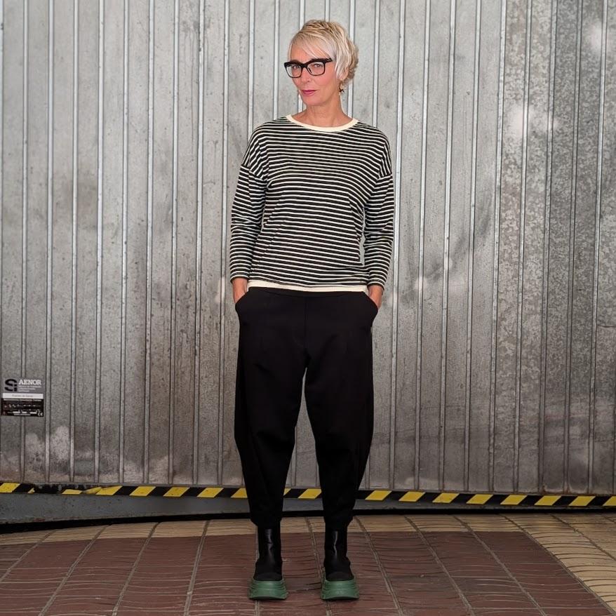 Pantalón oversize de diseño tipo japonés. Pernera ancha con cinturilla elástica. Bolsillos. Corte bombacho de tiro caído. Sin cierres. Ajuste holgado y cómodo. Tejido punto milano.