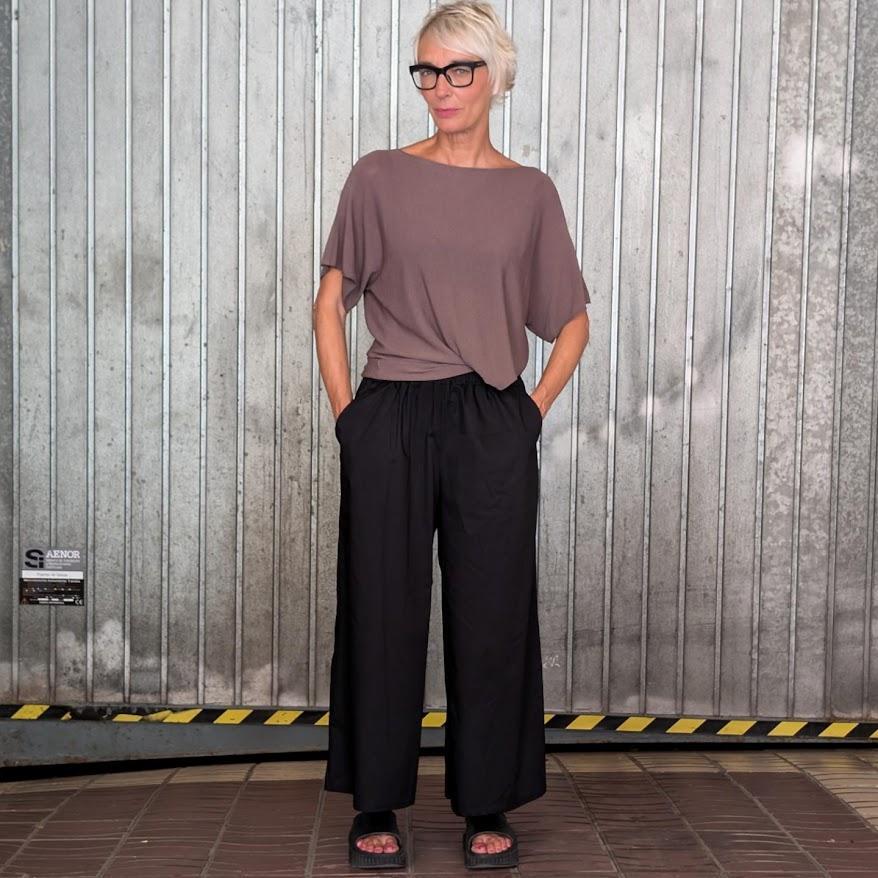 Pantalón básico de corte holgado. Goma en la cintura. Pernera extra ancha. Bolsillos.