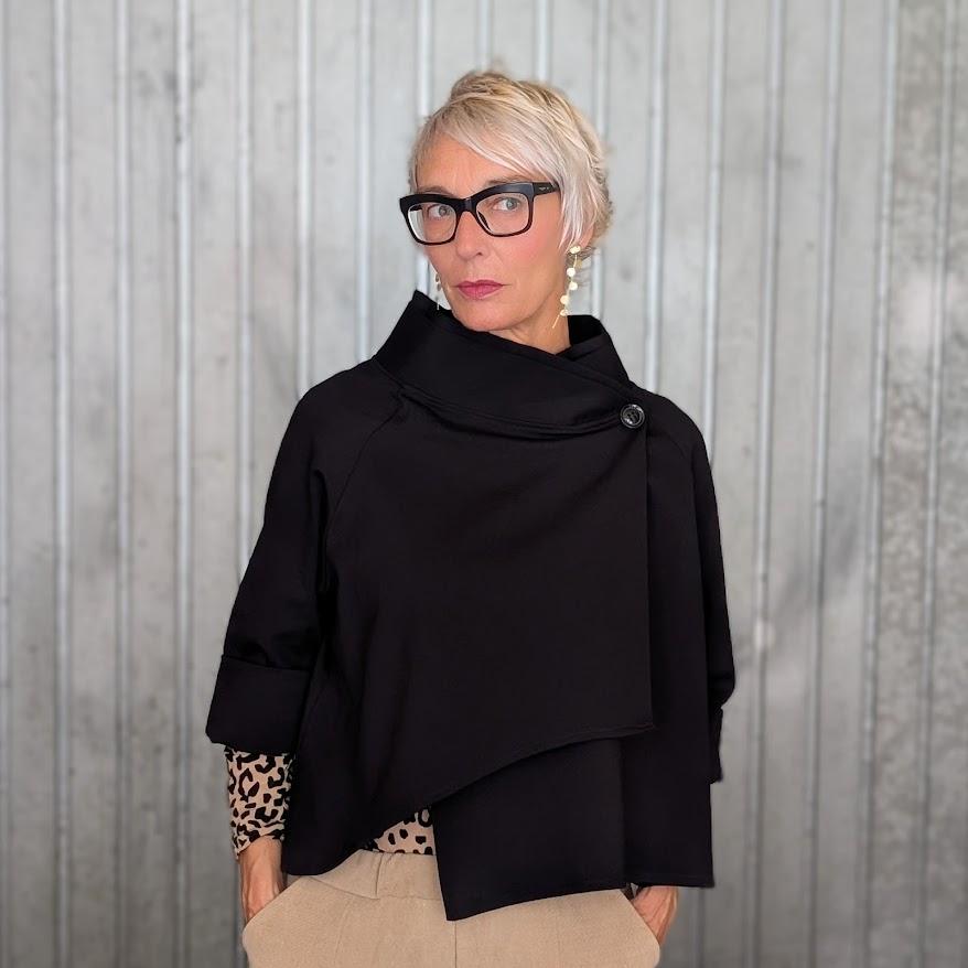 Chaqueta de corte capa con cuello chimenea. Cierre de botón en el cuello. Estilo moderno y cómodo en punto milano.