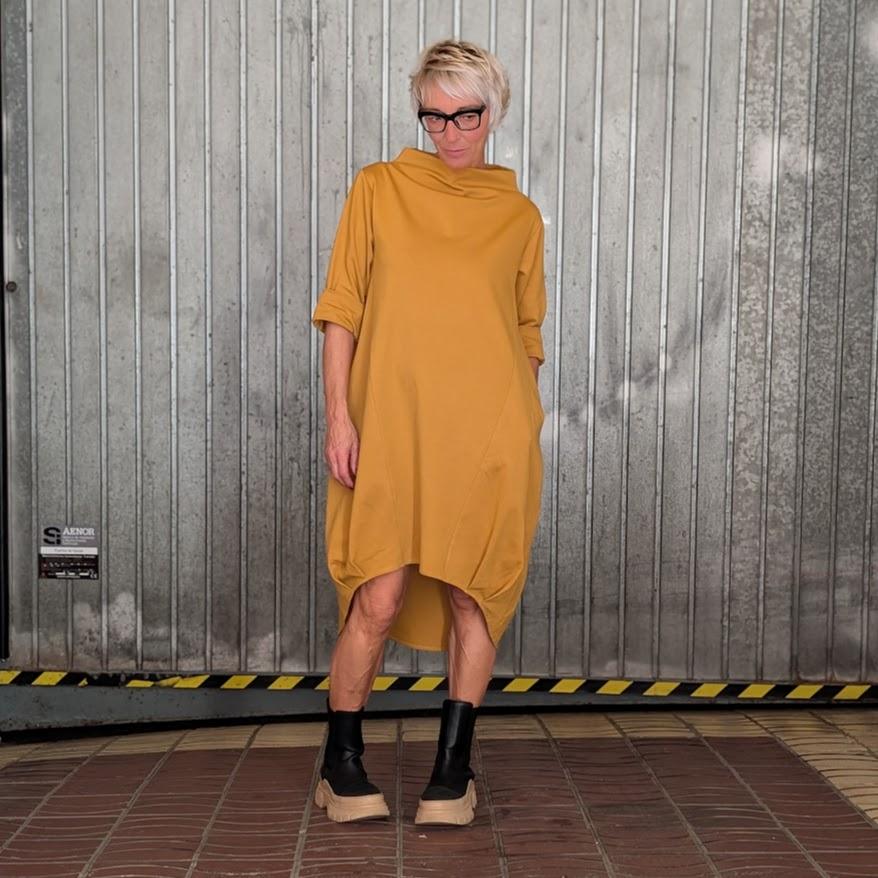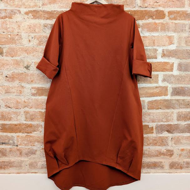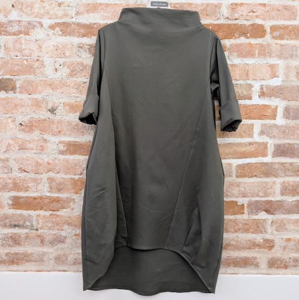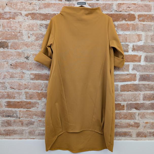 Vestido Valeria de corte oversize en punto milano, con bolsillos y un diseño urbano y cómodo. Cuello chimenea. Diseño globo más corto por delante.