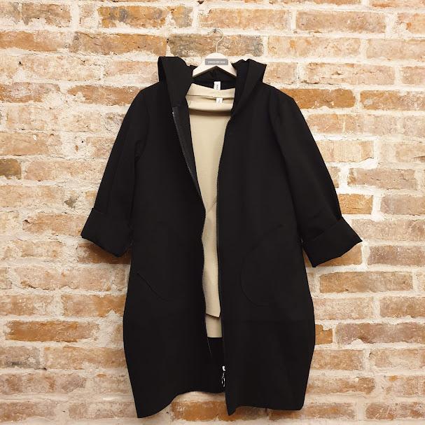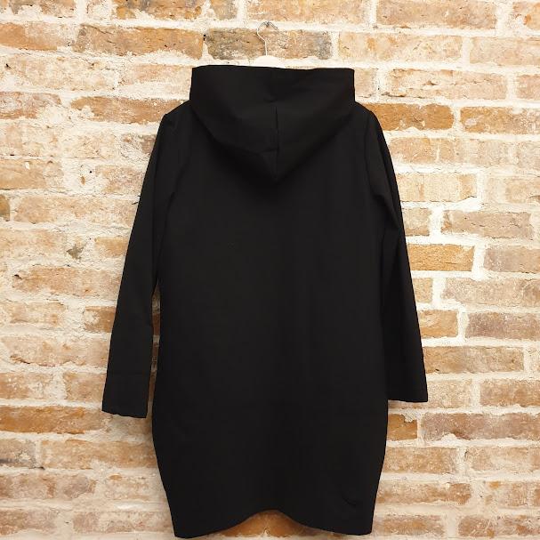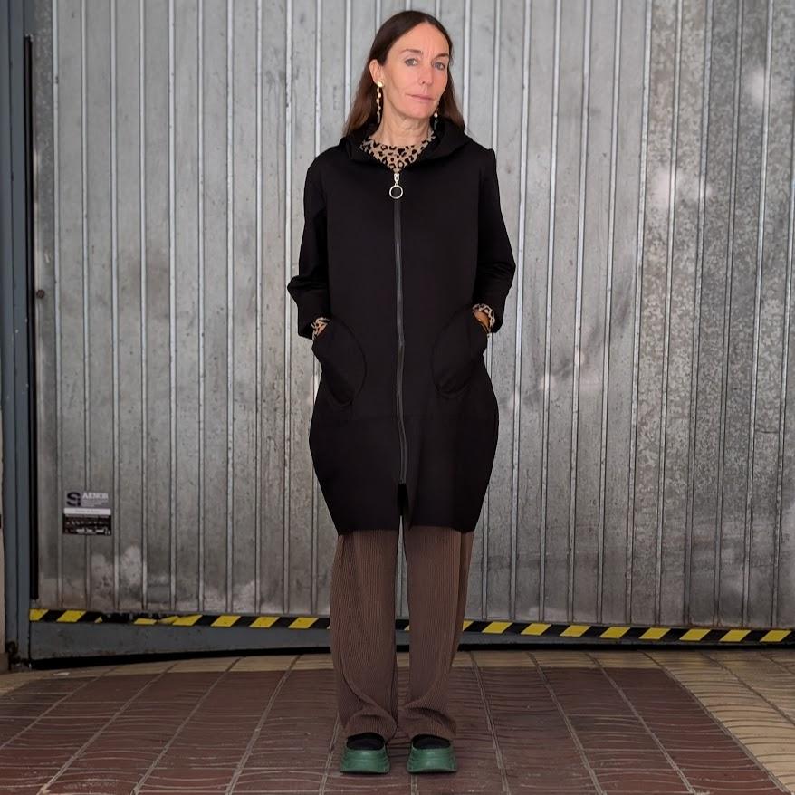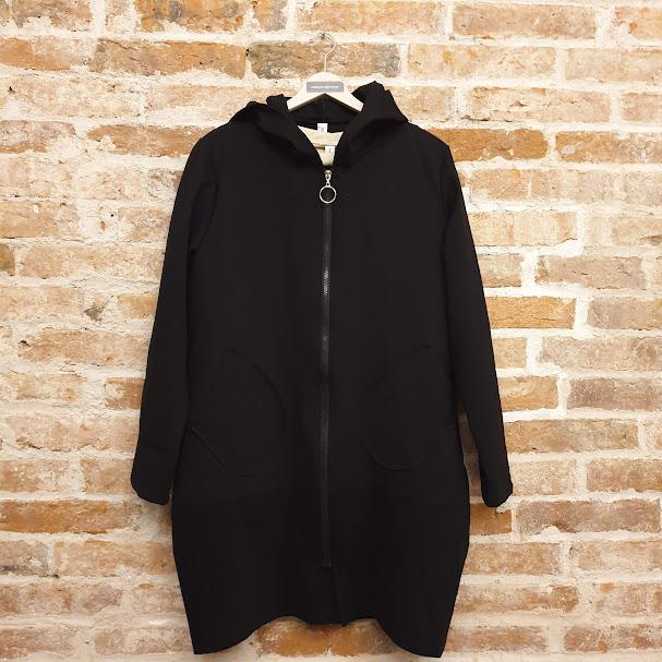 Abrigo ligero de punto Milano con capucha, cierre de cremallera y bolsillos delanteros amplios. Comodidad y estilo en una sola prenda.
