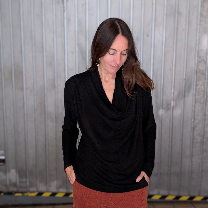 El Top Mirta destaca por su cuello con caída y su diseño fluido, ideal para crear conjuntos de fiesta llenos de estilo y comodidad.