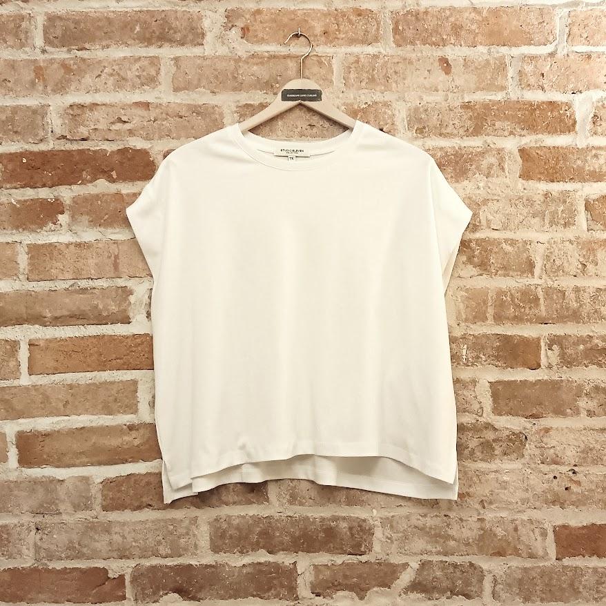 Camiseta básica de manga corta amplia, cuello redondo y patrón cuadrado, cómoda y minimalista. Abertura en los laterales.