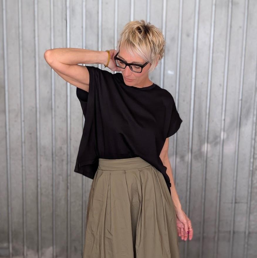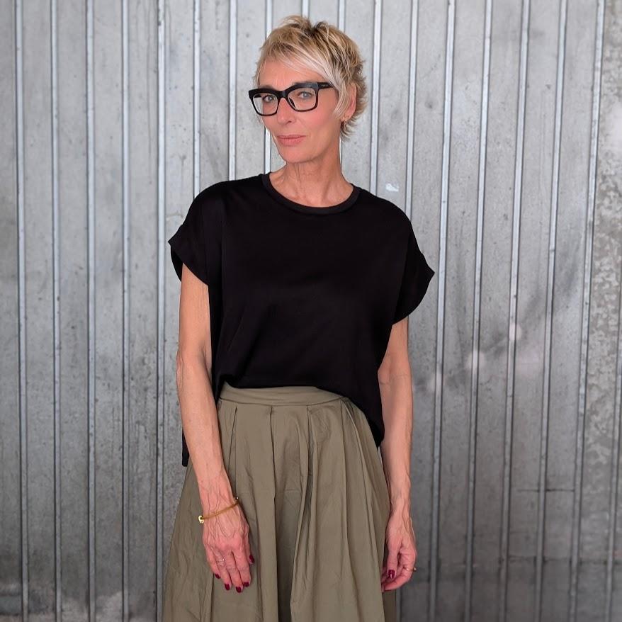 El cuello redondo clásico refuerza su versatilidad, permitiendo combinarla fácilmente con faldas, pantalones amplios o prendas más estructuradas. Una camiseta atemporal que encaja con la filosofía de moda cómoda y consciente de Guadalupe Loves Curling.