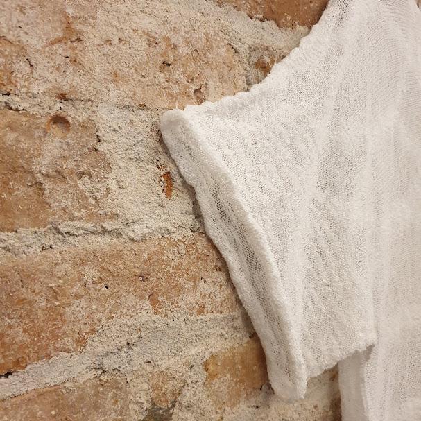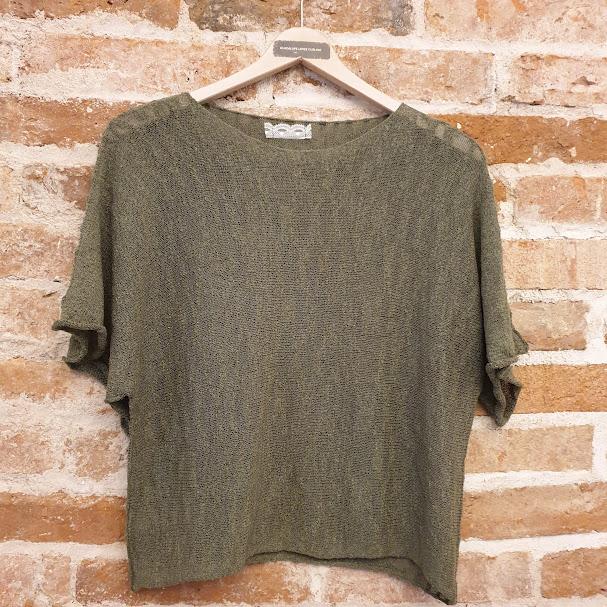 Top oversize de punto rizado, ligero y semi transparente. Cuello medio barco, marga corta ancha con costura visible. Una prenda cómoda y versátil para elevar tus looks con naturalidad.