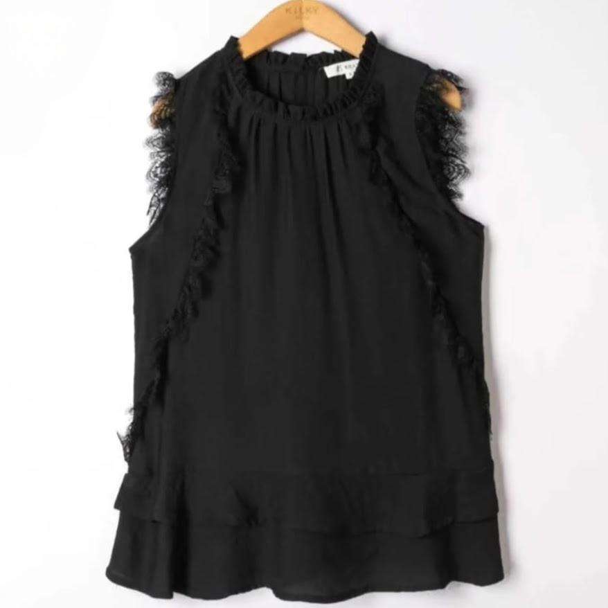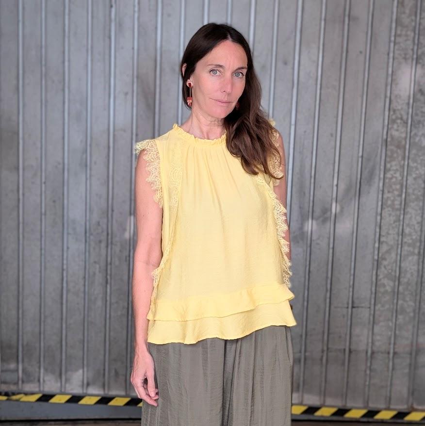 Su cuello fruncido aporta delicadeza y estructura, mientras que los volantes verticales en la parte frontal estilizan visualmente la silueta y añaden dinamismo. El diseño sin mangas refuerza su ligereza, convirtiéndola en una pieza cómoda y muy fácil de llevar.