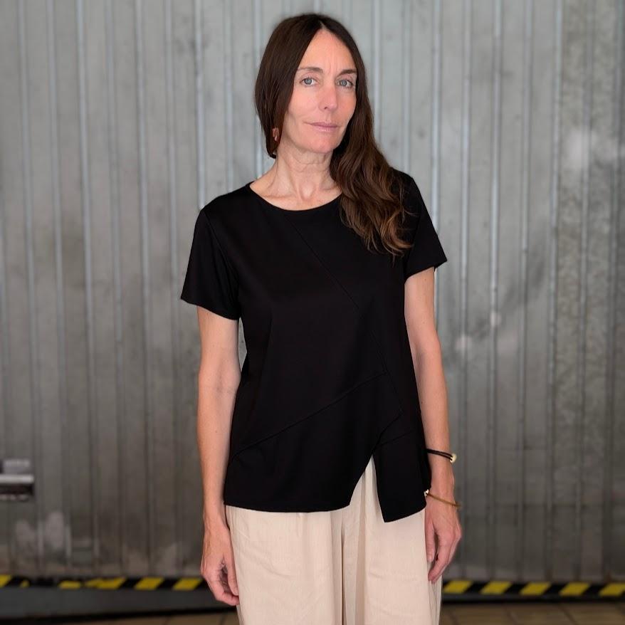Camiseta de diseño con estructura marcada. Cuello redondo y mang corta, Una prenda diferente para elevar cualquier look.